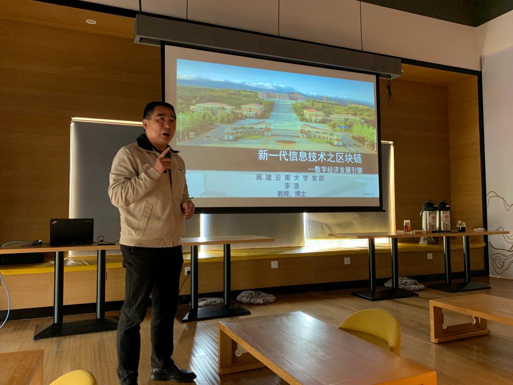 中国民主建国会云南大学支部主委李浩教授作了题为“新一代信息技术之区块链”的主旨发言。李浩教授用宏观的视野,深入浅出地向参加活动的师生介绍了区块链的来源、技术原理、优势与缺陷、现状应用与展望四大方面的内容。生动形象的为大家解读了新一代信息技术知识,引起大家的强烈兴趣,进行了热烈的讨论交流。