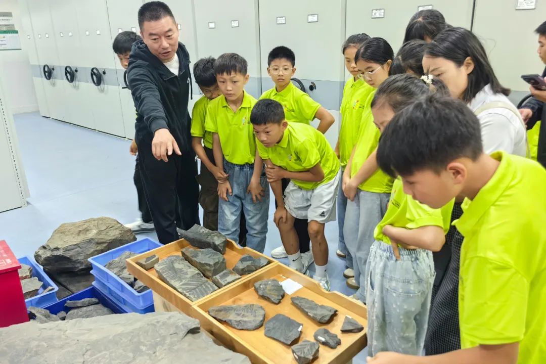 小学生们来到古植物化石标本库,近距离端详珍贵馆藏标本,认真观察了化石的形态与纹理,听大学教授讲解各类化石的产地及采集过程。龙头山镇中心小学的高成宇同学面对一块化石惊叹道,“没想到这块化石采自我家乡昭通!我仿佛穿越了时空!”