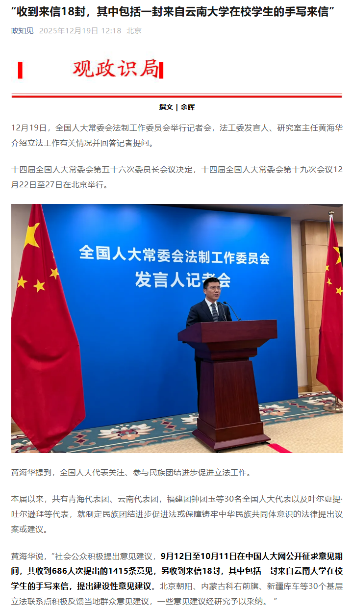 12月19日,全国人大常委会法制工作委员会举行记者会,法工委发言人、研究室主任黄海华介绍立法工作有关情况时,提及“一封来自云南大学在校学生的手写来信”提出了建设性意见建议。