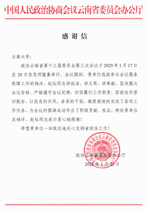 中国人民政治协商会议云南省委员会办公厅致云南大学感谢信